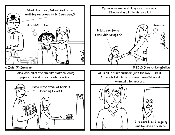 I think Nikki has worn more outfits than any other character. Actually, I’m pretty sure this comic alone puts her well in the lead with four, and I know she has at least one long sleeved shirt. And pajamas. Wow. That is a lot for a comic where a certain fluffy-haired guy wears the same shirt all the time (even under the Santa suit). Actually, he has multiple Stein Auf shirts. Otherwise that would be disgusting.