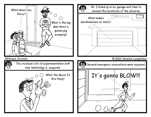 This comic serves as a couple reminders as well as talking about Percy’s summer. For one thing, Jorocks is still in the room, despite being off-panel for the past two weeks. For another, it is a reminder that Jorocks (and Chris) do not know about the alien technology or what Ichabod really is. And finally, it reaffirms that Percy, despite realizing that not every chemical reaction results in explosives, really loves making things go boom.
