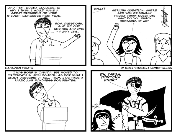 I’ve been looking forward to making this part of comic continuity for about a year now. First of all, for those of you who don’t remember (and I certainly wouldn’t blame you), that is Chad. I don’t believe that his name has ever actually been said in comic, though. Chad is your do-it-all guy on campus. He’s already been shown as playing a role on the student activities council and admissions (see links above). Apparently he’s shaved his beard off since then. Now he’s running for Student Congress President. I should note that he is a junior at this point, putting him one year ahead of Percy and co. Chad was somewhat based off of myself (I was quite active on campus, but not quite to this extent), but has since deviated.