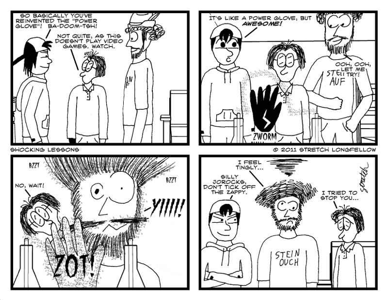 After reading the previous comic, one of my friends made the joke of “power glove”. A minor script edit later, and you see the result. Also, Jorocks is just too fun to look at when he gets electrocuted. Poor guy, that means it’s likely to happen repeatedly.