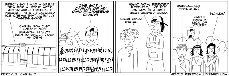 You’ll also notice that this is the first time I’ve used the generic background circle faces. Not usually my style, but I felt it would make my actual characters stick out better instead of blending in. Also, as I was trying to come up with lines for the fourth panel, I realized I HAD to make Matt say “Yowza”. It also gave me a chance to show Sally’s crush on Chad a bit; this was supposed to appear in On A Side Note, but it got dropped.