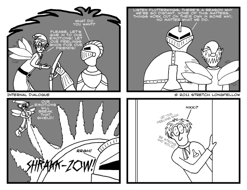 Oh, this comic… This was a lot of fun to make. I’ve always wanted to try my hand at a fight scene, but Spoofy Randomness doesn’t lend itself to such an opportunity very often. However, internal dialougue can be quite the fight, so I opted to visualize it and it kind of snowballed. First I put emotionless Percy in a suit of armor, then emotion Percy got fairy wings and elf ears, and finally he wound up with the Santa outfit, which of course is highly appropriate.
