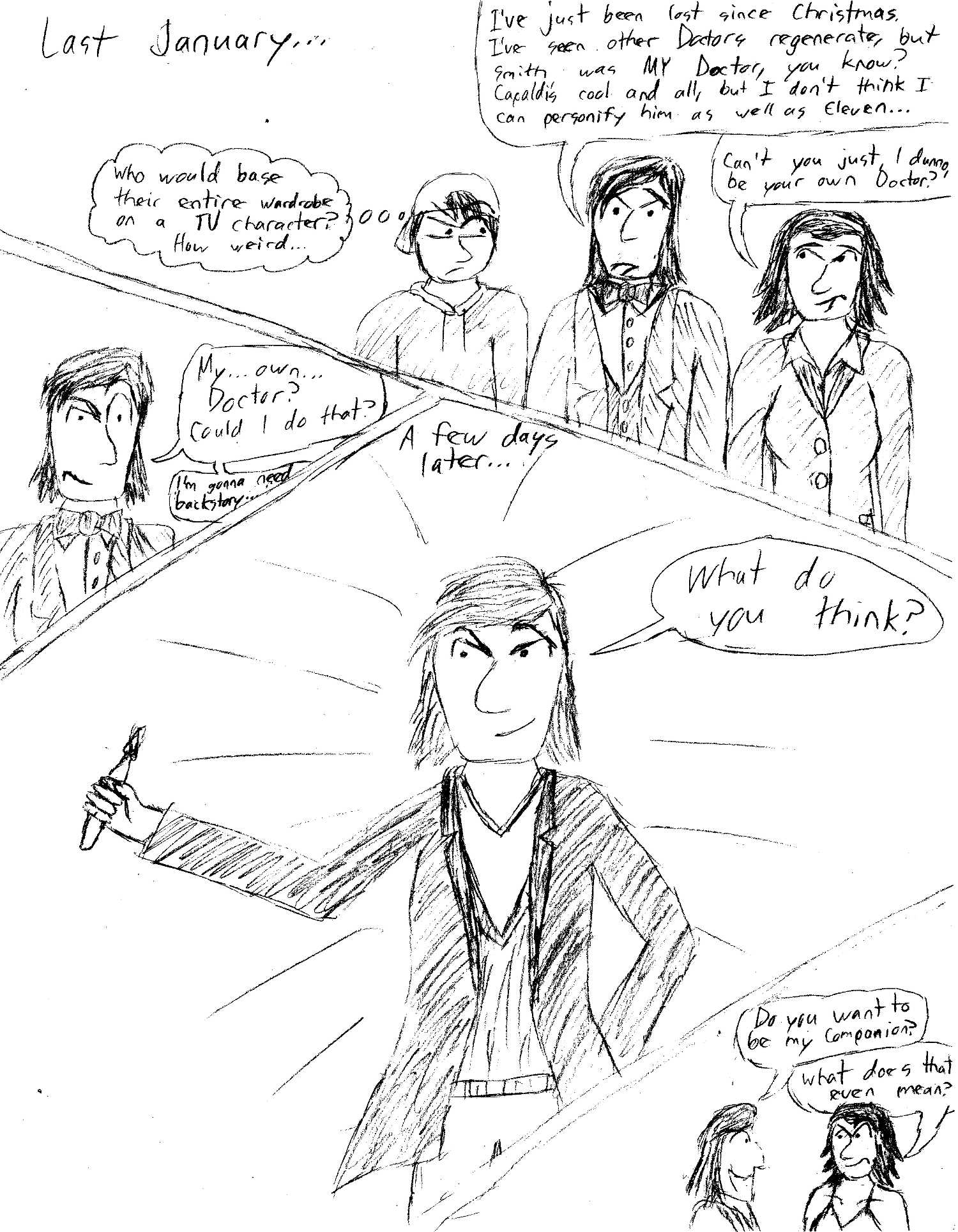 This probably would have made its way into the main comic as a mini-arc if I was still updating three times a week. I realized as I was writing the script for 2014 that Matt’s imitation of the Eleventh Doctor would no longer be immediately relevant, and he had a tradition of dressing as the new Doctor. However, it was one thing to have him start to dress as Smith’s Doctor, but moving from an actor who shared his name to Capaldi would not be an easy transition for Matt. Therefore, I decided to make him a brand new costume! His costume is based mostly off of what I often wore as a DM when I was in college; a red sweatervest over a white V-neck sweatshirt and a navy suitcoat (I was mad stylin’, yo). His hairstyle is also similar to mine in college, although longer as he still had his Matt Smith haircut. (I briefly considered giving him my glasses too, but decided against it.) At one point I had tossed around the idea of making a fake 12th Doctor trailer using that costume, but I never did.