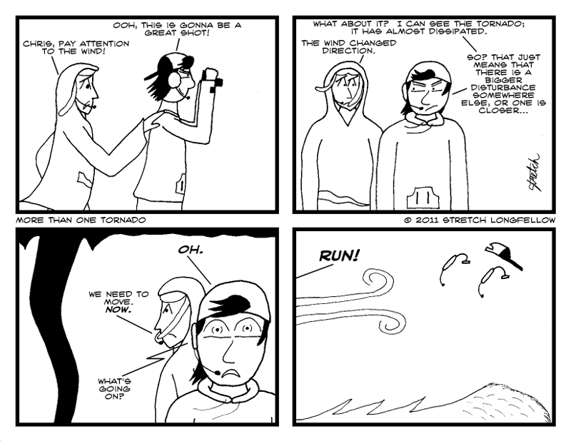 This comic is based off of a video I saw at my first Central Plains Severe Weather Symposium. Jeff Piotrowski had been filming one tornado when suddenly the wind shifted and he realized there was another one much closer behind him.