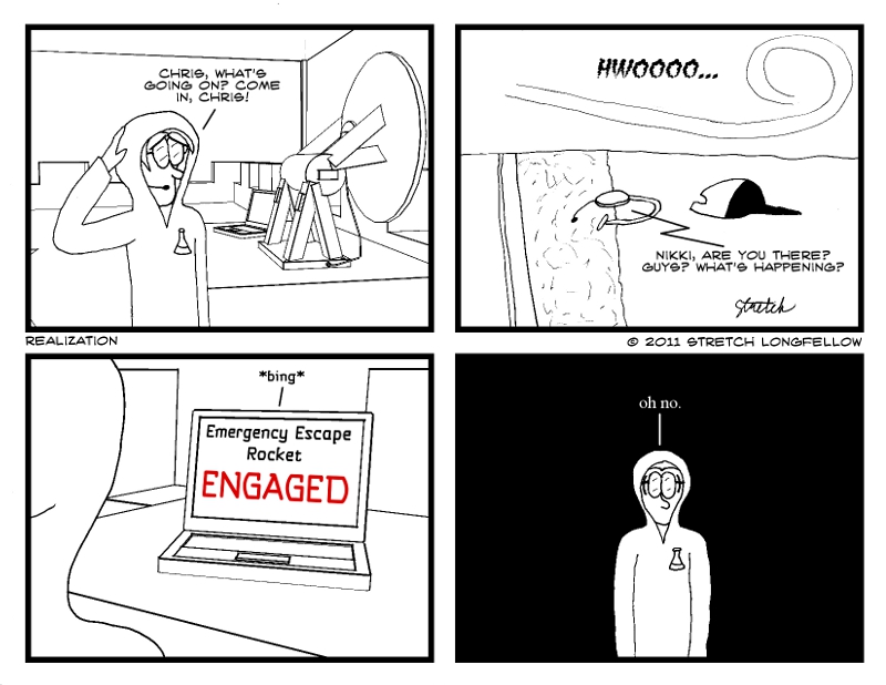 I wanted to use a comedic effect to actually be applied realistically, so in this case I used the comedic “run away while leaving hat/headsets behind” and had it actually happen. I also like the effect of Panel 4. It has a good sense of doom.